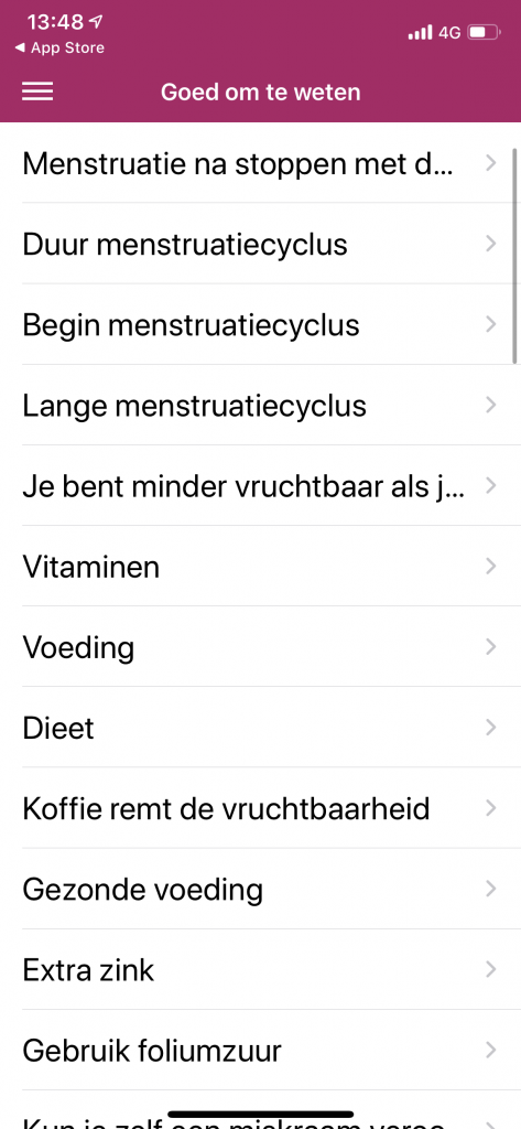 Door middel van het beantwoorden van de vragen in de intake, krijgen gebruikers inzicht in hun kalender: wanneer begint hun cyclus en wanneer zijn ze vruchtbaar? Ook bevat de app handige tips, feiten en fabels over allerlei onderwerpen rondom zwanger worden.