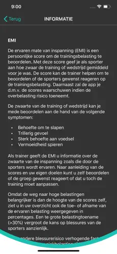 Op basis van een wetenschappelijk gevalideerde formule (de EMI score- Ervaren Mate van Inspanning) wordt vervolgens de kans berekend op overbelasting. De sporter krijgt een melding als de kans op overbelasting groter wordt, zodat hij of zij tijdelijk wat minder intensief kan gaan trainen.
